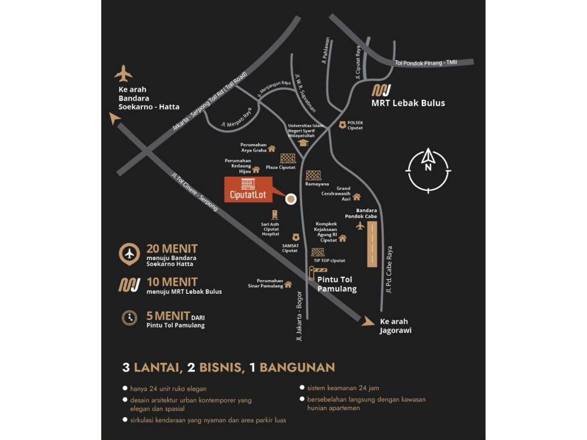 Ciputat Lot berada di area Central Bisnis District yang terdiri atas pusat komersial seperti mall, trade center,perkantoran,perbankan,hotel,apartemen dan rumah sakit