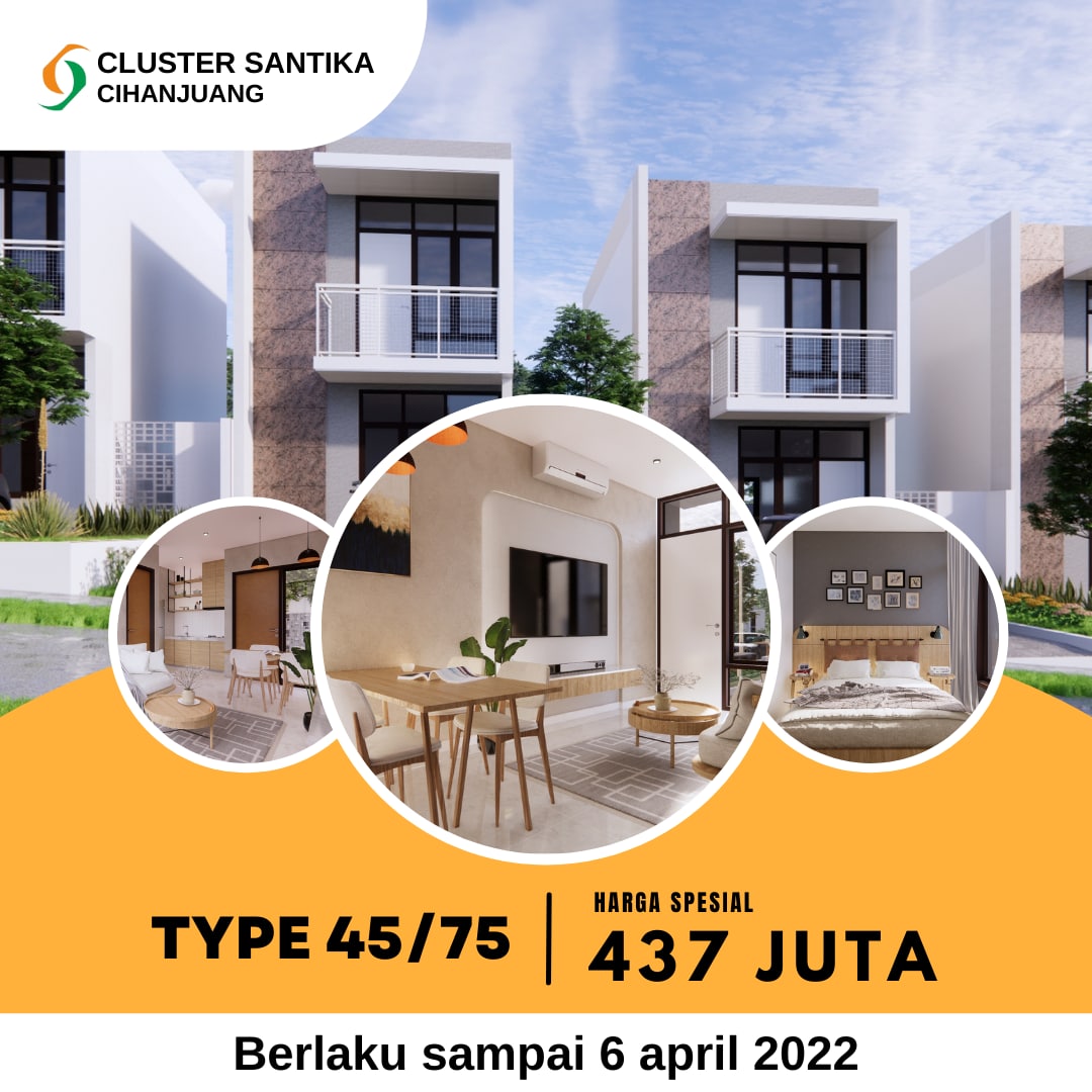 Cluster Santika Cihanjuang, rumah dua lantai dengan konsep modern minimalis, type 45/75. Rumah ini memiliki banyak keunggulan lainnya seperti: