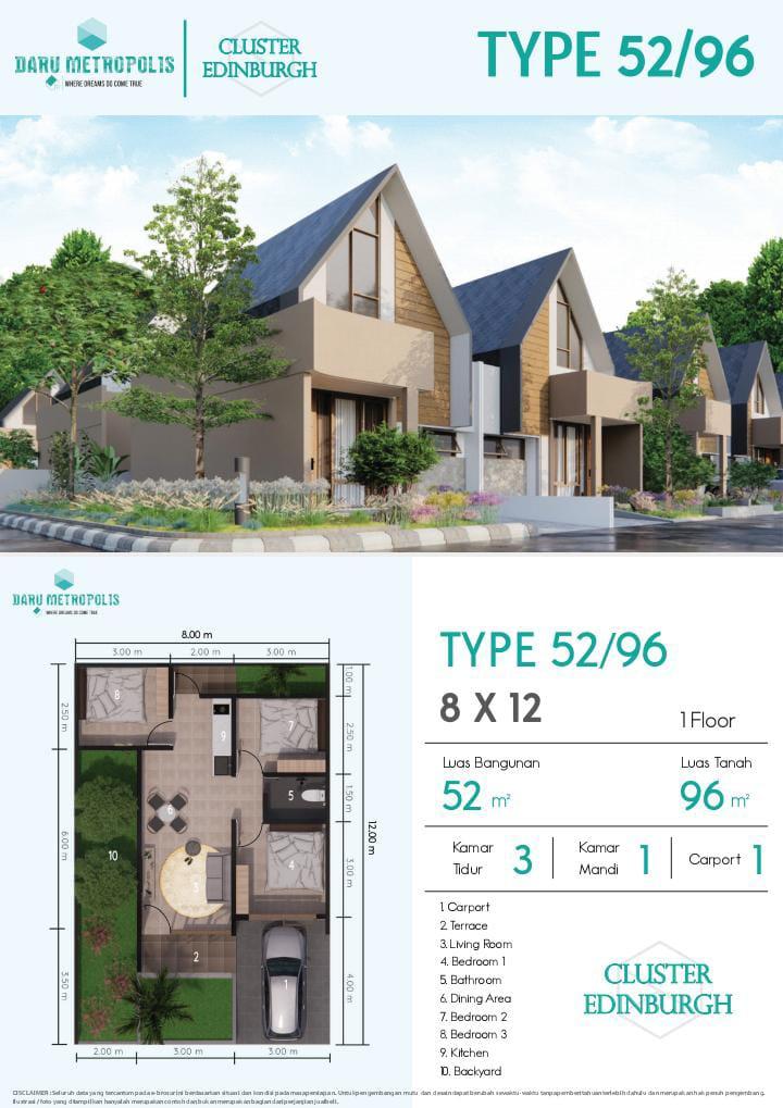 – CATANIA & EDINBURGH (Luas bangunan 36 & 52m², Luas tanah 96 m²). Kmr tidur 2(3), kmr mandi 1, Carport 1.