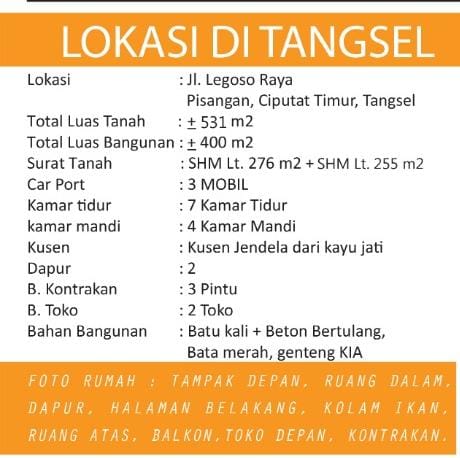 Dijual Rumah Strategis Cocok Untuk Usaha di Pisangan, Tangerang Selatan