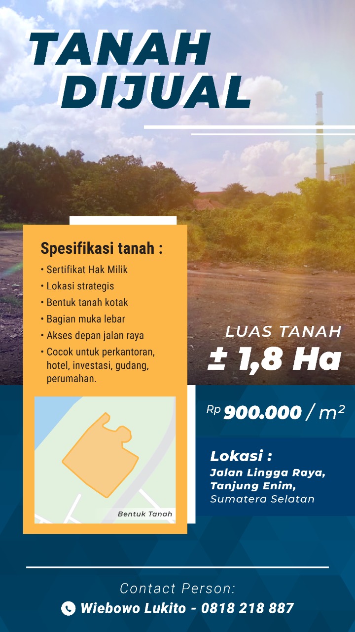 Jual Tanah Tanjung Enim, Muara Enim Seluas ±1,8 Ha