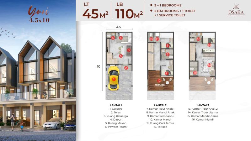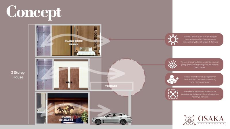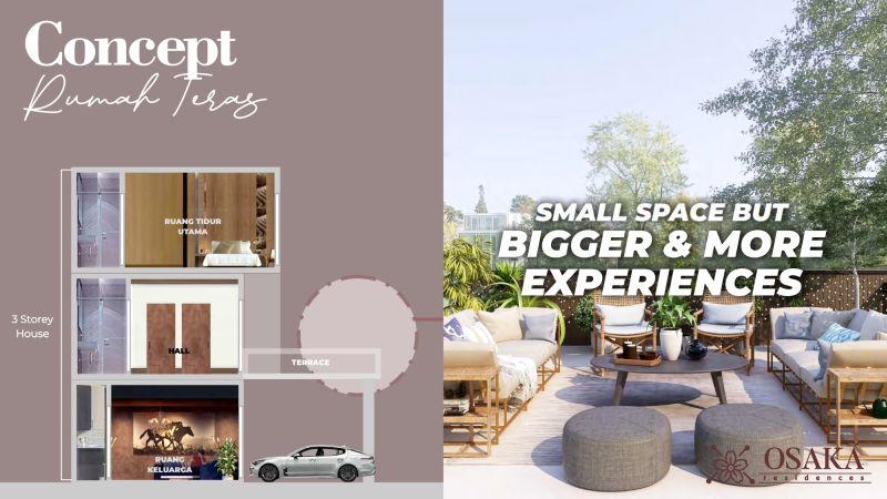 Tipe hunian dengan ukuran yang compact ini memaksimalkan area internal rumah dengan memperluas ke bagian luar rumah yaitu Terrace. Perluasan area tersebut memberikan pengalaman menyenangkan karena dapat dimanfaatkan sebagai area gathering, glamping, dan relaxing bersama keluarga dan sahabat tercinta.