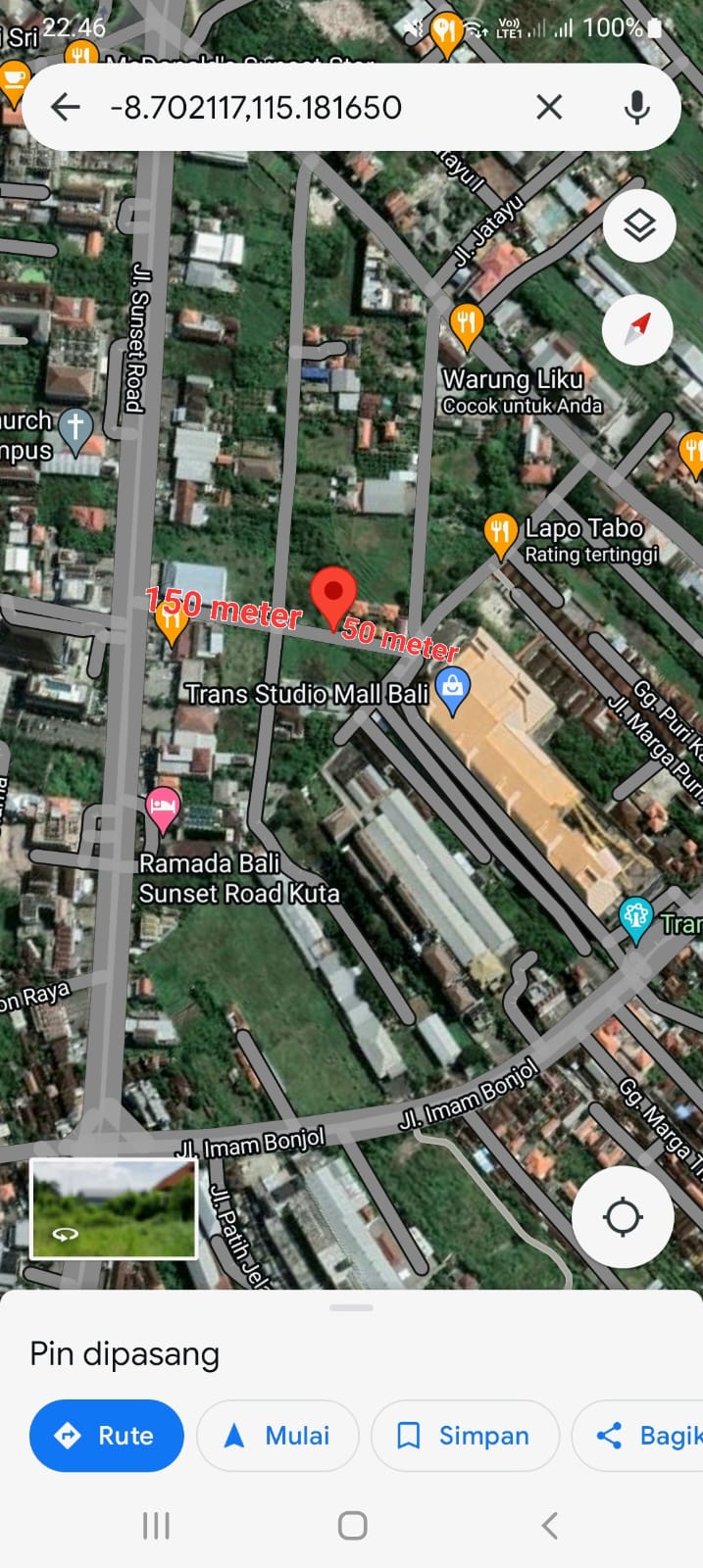 Lokasi tanah sangat strategis, hanya 150 meter dari baypass sunsetroad dan 50 meter dari trans studio mall bali dan lingkungan sekitar villa² komersil dan guesthouse serta kost² elit