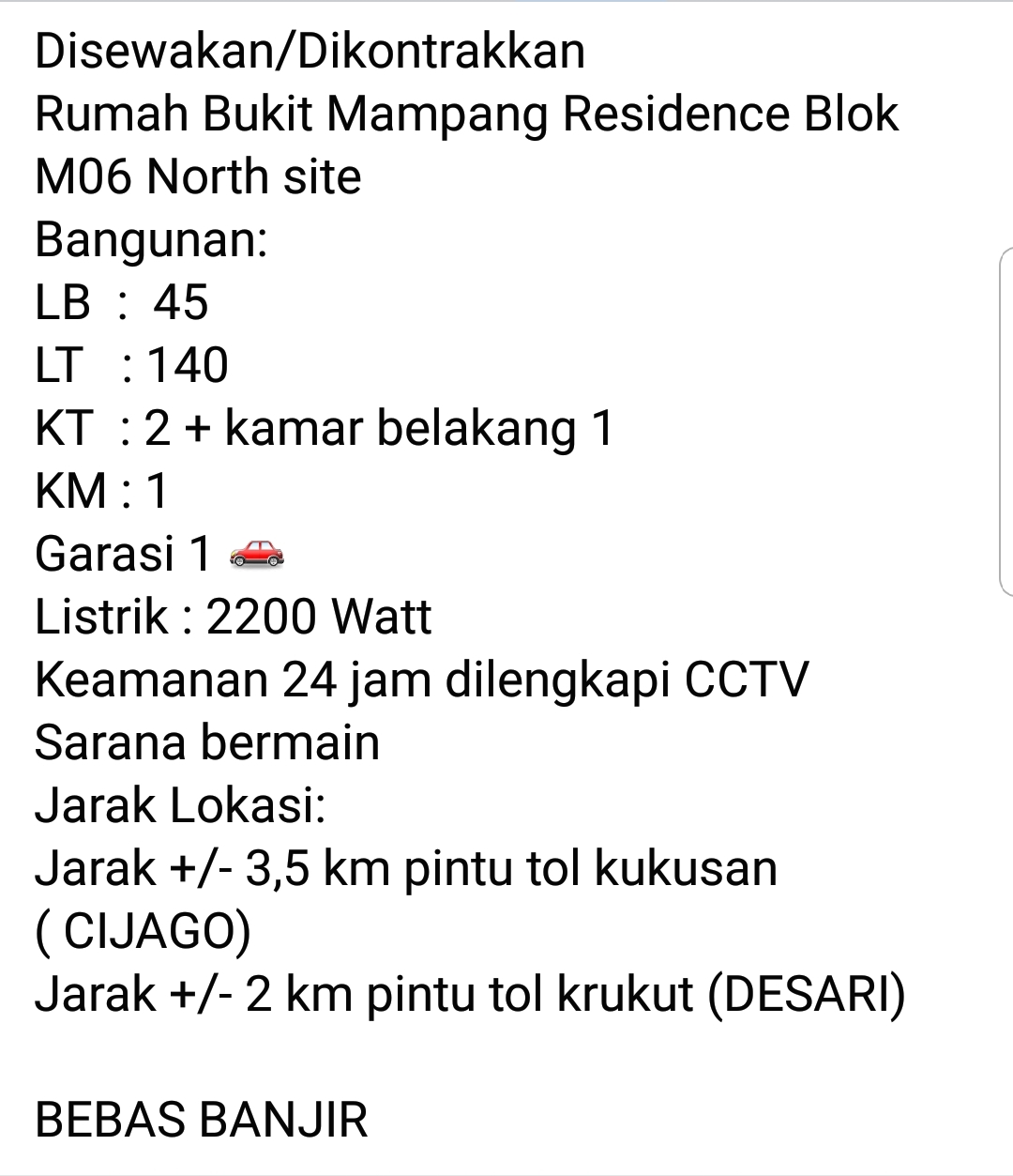 - Jarak +/-2 Km Pintu Tol Krukut (Desari)