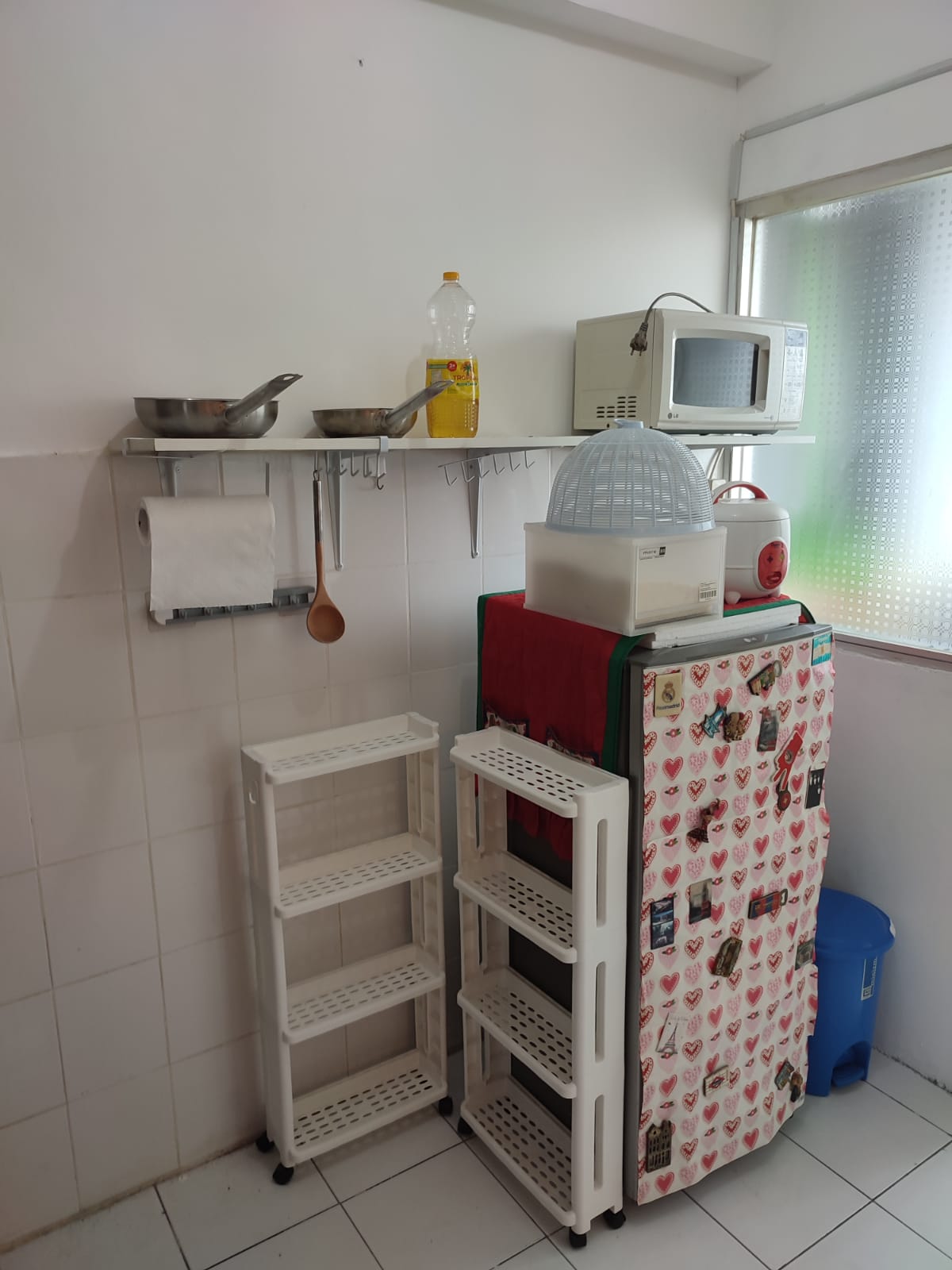 D. Kitchen: Kulkas 1 pintu (1), kitchen set (termasuk tabung gas biru 12kg (1) + peralatan makan + peralatan masak), ambalan dinding (2), microwave, tempat beras, rice cooker, rak bumbu dapur (2), tempat sampah