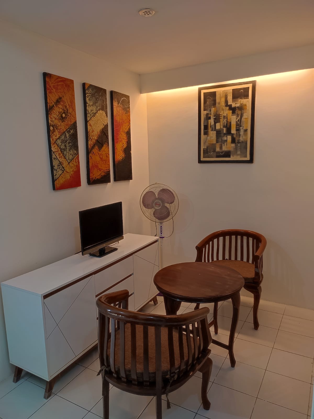 C. Living Room: chairs (2) + table, meja TV, TV, kipas angin, standing dispenser + galon pristine