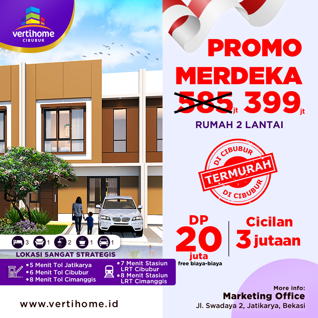 Harga perdana rumah 2 lantai di Vertihome Cibubur, dari termurah di kawasan Cibubur dari 585jt menjadi lebih murah lagi... Harga menjadi 399jt !