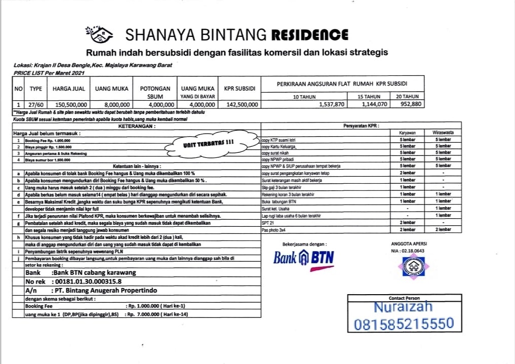 Dijual Rumah SUBSIDI type 27/60 SHANAYA BINTANG RESIDENCE Karawang