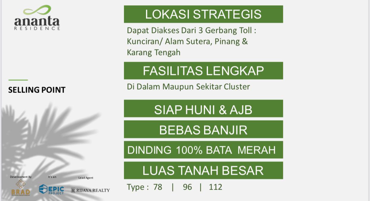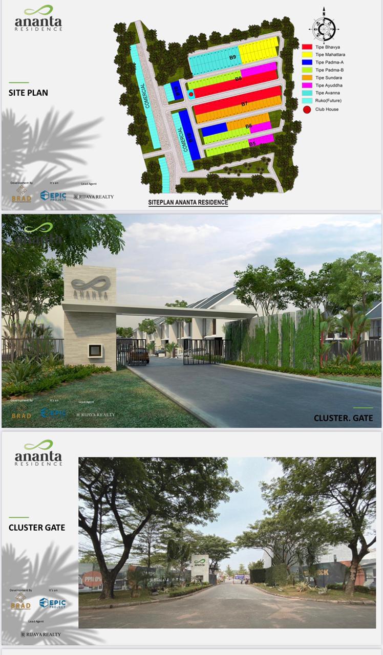 Cluster Ananta residence dilengkapi one gate system/portal otomatis, jaringan bawah tanah, clubhouse/kolam renang dan CCTV kawasan 24 jam, serta kawasan BEBAS BANJIR.