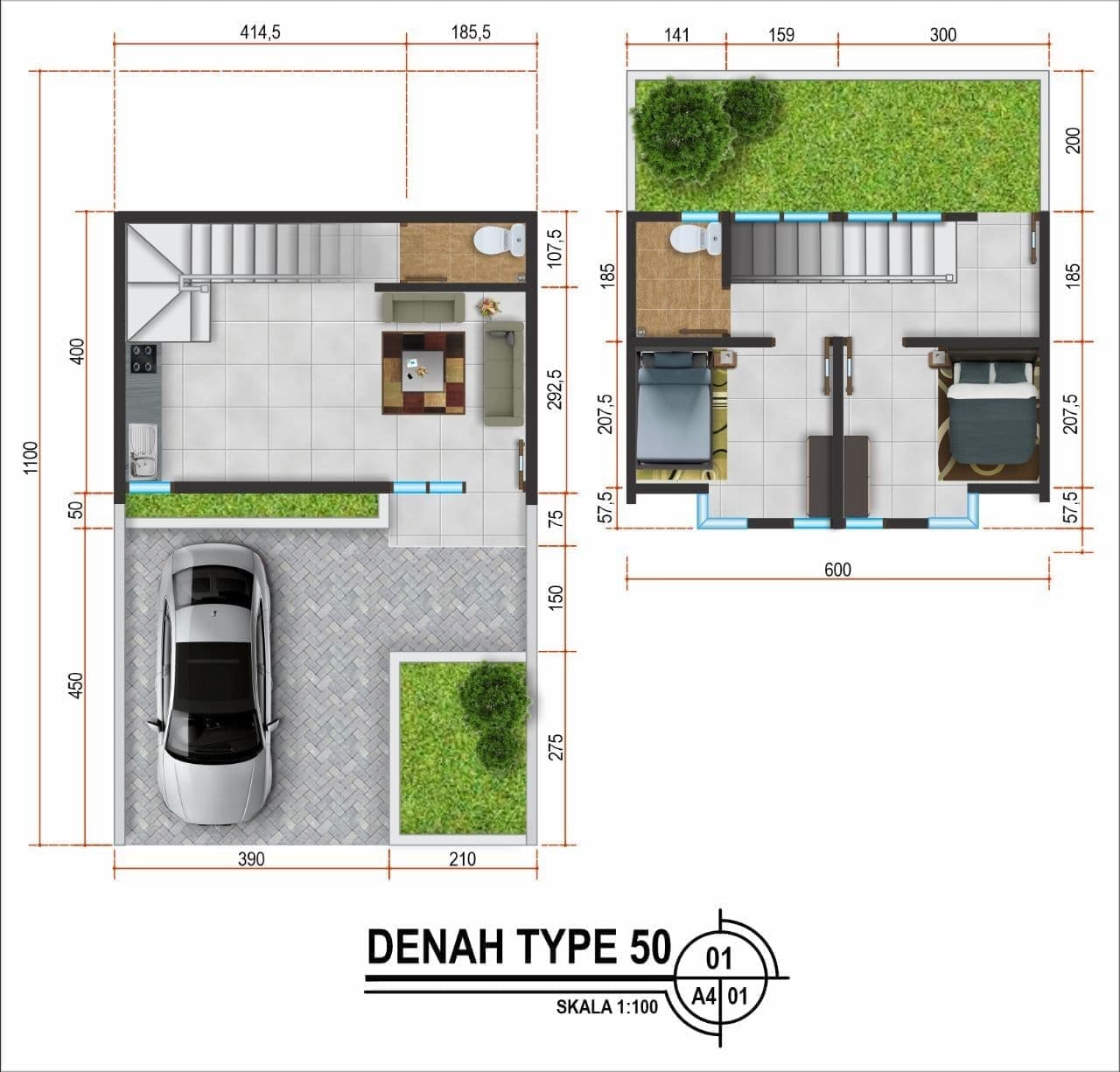 2 kamar tidur, 2 kamar mandi, ruang tamu, dapur, carport