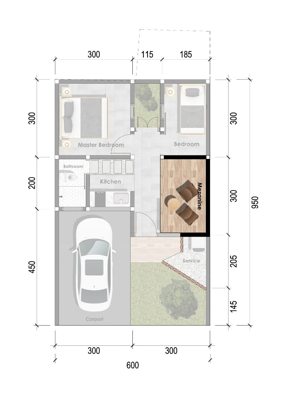 2 kamar tidur, 1 kamar mandi, ruang tamu, ruang keluarga, dapur, carport, taman, mezanine, Smartlock system RFID Card, Smart CCTV