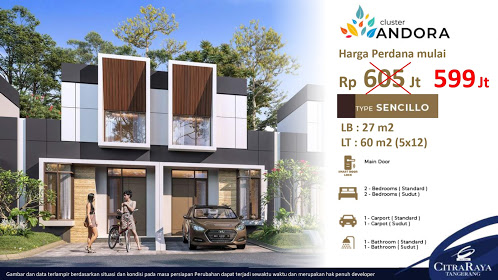Dengan desain yang inovatif dan modern sangat cocok sebagai hunian milenial. Mengikuti perkembangan new normal saat ini dengan konsep rumah tumbuh dan rumah sehat. Dimana rumah di cluster andora dilengkapi dengan area outdoor taman di halaman belakang yang kemudian dapat dimanfaatkan apabila ingin memperbesar rumah. Dipasarkan dalam beberapa ukuran yaitu 5x12, 5x15 dan 7x15. Dijual dengan harga mulai dari 599 Juta (termasuk PPN).