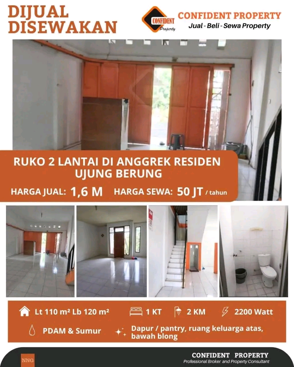Listrik 2200watt token, air pdam & sumur, dapur/pantry, 1kt,2km,ruang klrga atas, bawah blong.