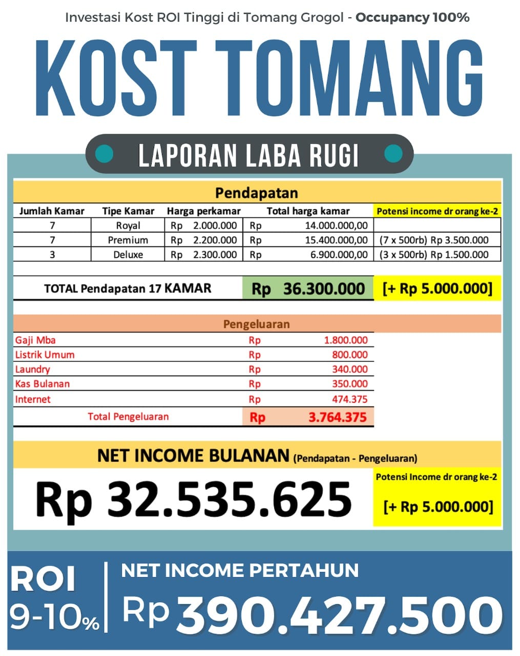 PLUS Potensi Tambahan Income Rp 5 Juta jika Kamar dihuni berdua (10 x 500rb)