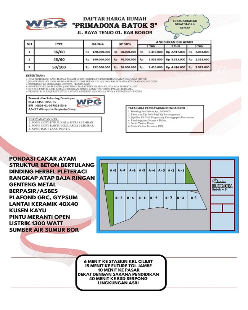 Alamat Lokasi Rumah: Cluster Primadona Batok 3, Jl. Raya Tenjo Kel. Batok, Kec. Tenjo, Kab. Bogor. Lokasi strategis, lingkungan perumahan asri aman nyaman dan bebas banjir.