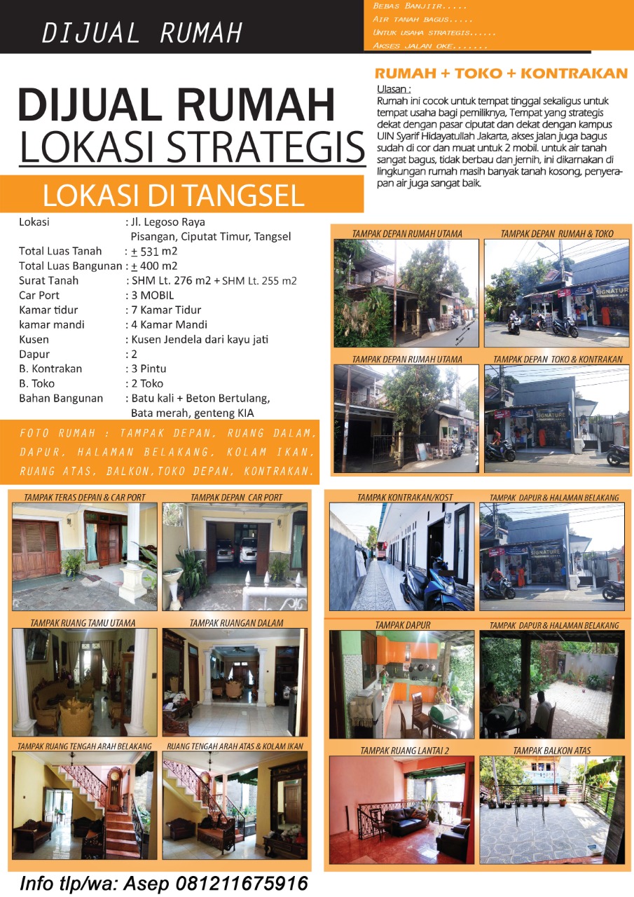 Dijual Rumah Strategis Cocok Untuk Usaha di Pisangan, Tangerang Selatan