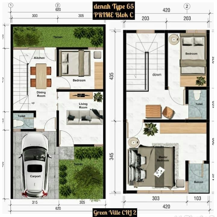 3 kamar tidur, 2 kamar mandi, dapur, carport, ruang tamu, ruang keluarga