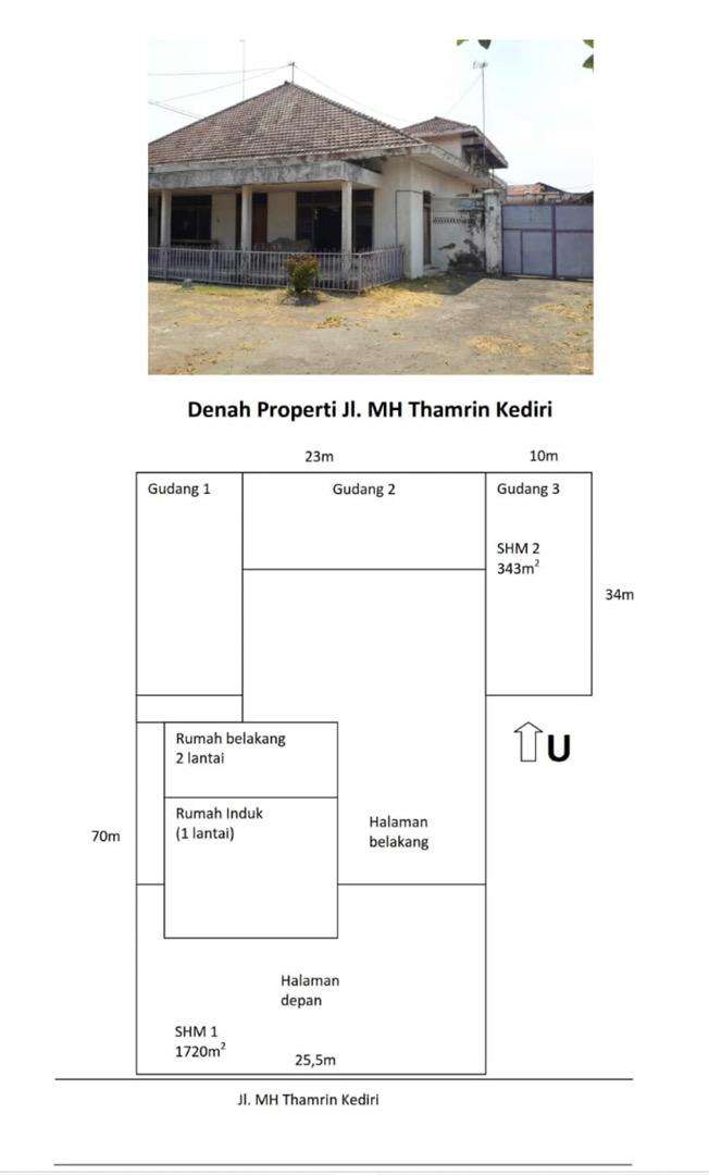 Rumah dan Gudang Moh. Husni Thamrin Pusat Kota Kediri Strategis. Lt 2063. Lebar depan 25 meter. Lb 1300 (rumah 500m, gudang 800m). Hadap Selatan. SHM. Posisi nol jalan strategis untuk usaha. Jual 10M nego.