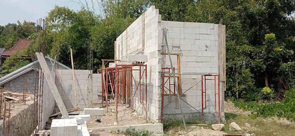 Pondasi batu kali,struktur beton bertulang,cakar ayam,dinding bata ringan,plafon gypsum,rangka atap baja ringan & genteng beton flat,lantai granite 60 x 60,closet duduk,kusen jati,air PDAM,listrik 1300W