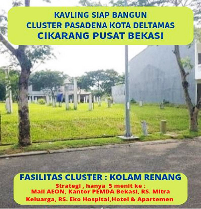 Tanah Kavling Dijual Siap Bangun di Kota Deltamas Cluster Pasadena Cikarang Pusat Bekasi Dekat AEON Mall Deltamas, Dekat Mall Lippo Cikarang, Dekat RS Mitra Keluarga Deltamas, Dekat Gerbang Tol Cikarang Timur, Dekat RS Mitra Keluarga Deltamas, Dekat PEMDA Kabupaten Bekasi.